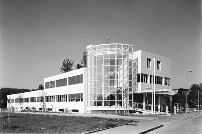 Großzügig angelegter Eingangsbereich für den Empfang der Kunden. Ausstellungsraum, Einzel- und Großraumbüros und eine Cafeteria mit schönen Ausblicken auf den intensiv begrünten Dachgarten. Ziel unserer Arbeit war es, ein Gebäude zu schaffen, welches neben dem funktionalen Wert eine hohe innere Qualität aufweist: Das Gebäude ist als Stahlbetonskelettbau konstruiert. Die Ausfachungen sind mit Betonmodulsteinen ausgemauert. Im Inneren bestimmen weiß gestrichene Decken und Wände, kombiniert mit Holztüren, Holztreppenstufen, Licht und Pflanzen die Atmosphäre. |